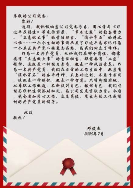 滿腔深情寄紙箋!合力泰黨委發出“我給組織寫封信”活動倡議,一個月時間,先后收到近百封來自基層一線的黨員信件。大家緊密結合擔負任務談感想、述忠誠、作承諾,寫下發揮先鋒作用的決心,和實現崗位建功的信心。